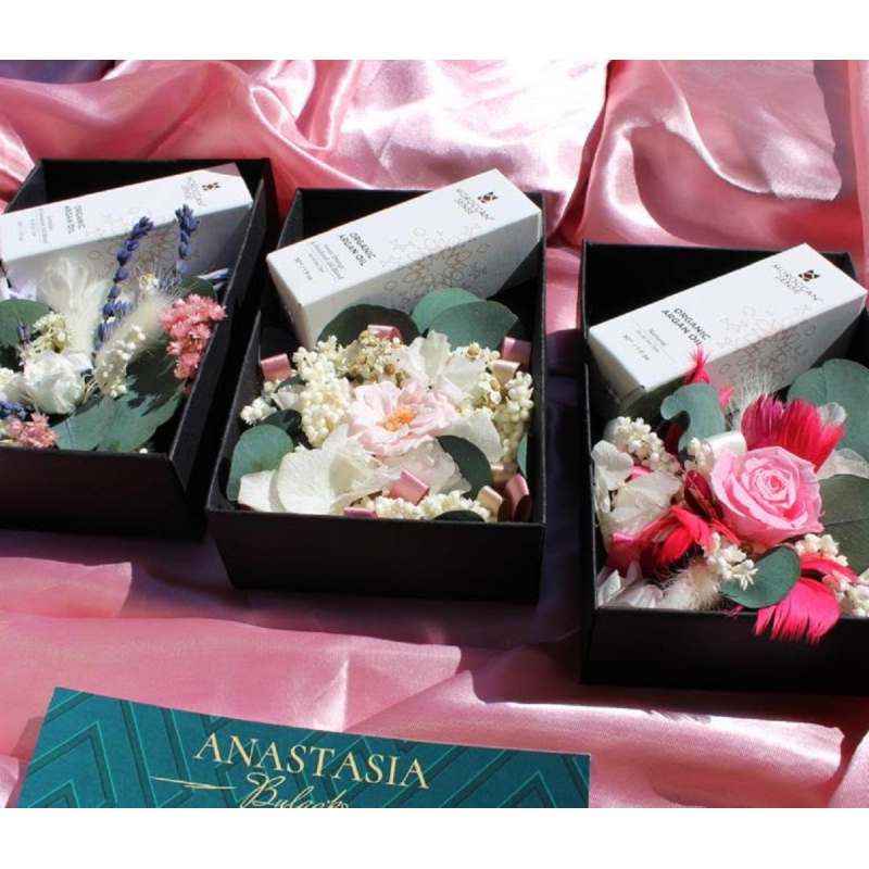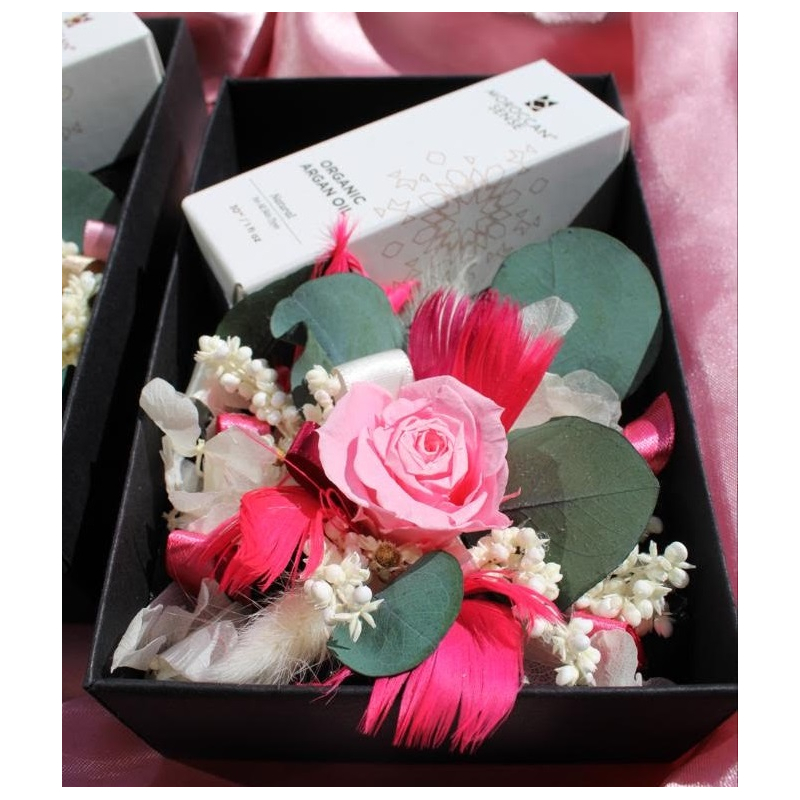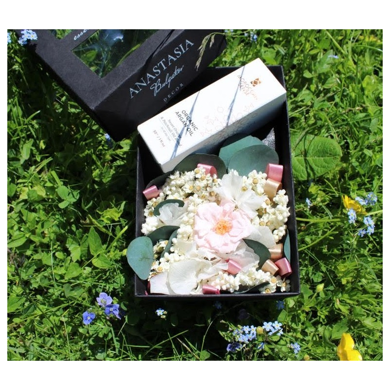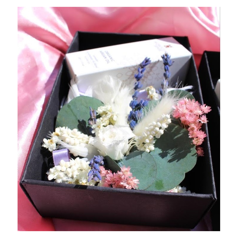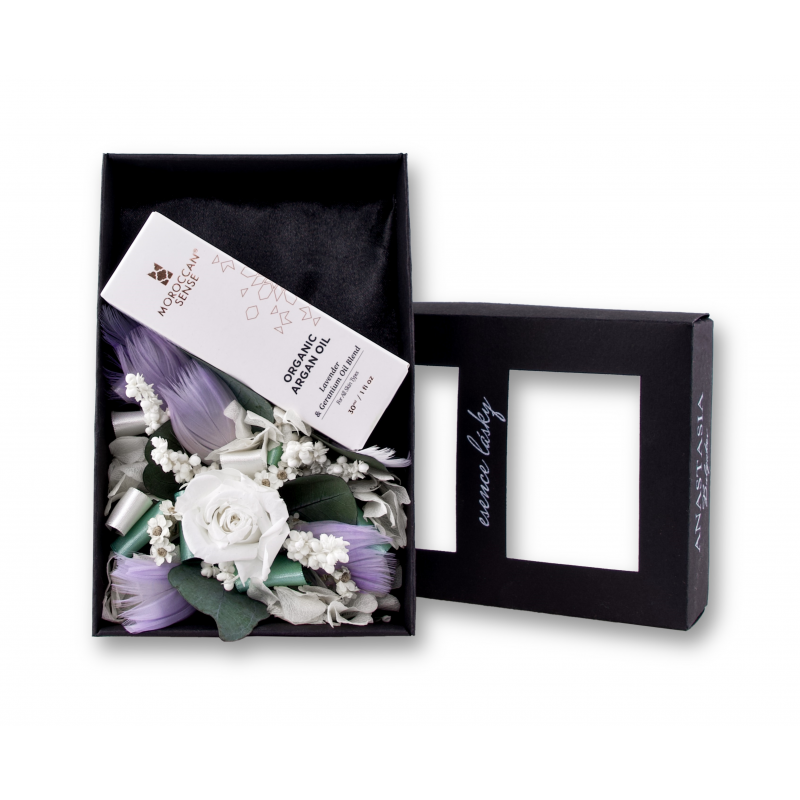 ESENCE LÁSKY představuje ručně vyráběnou dárkovou krabičku se stabilizovanými a sušenými květinami v kombinaci s arganovým olejem. Skvěle se hodí jako dárek pro ženy i dívky, k narozeninám, svátku nebo jen tak z "LÁSKY".
